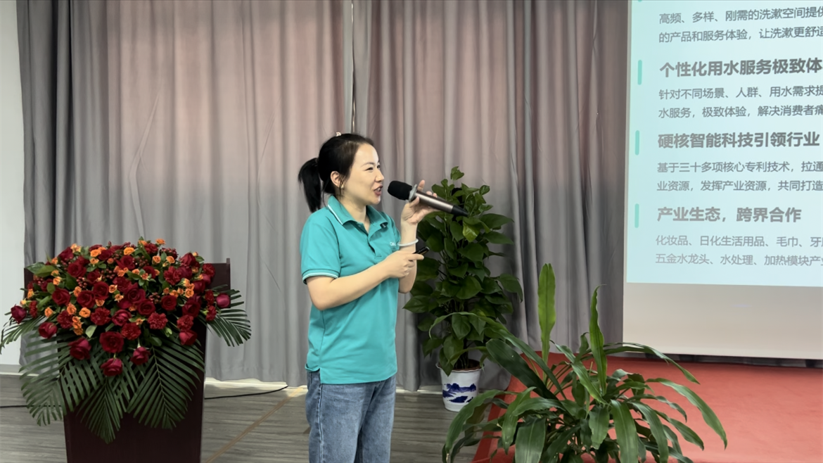 參觀結束后,家樂士團隊與研學小組舉行座談會議,會議由公司副總翟冬波主持,一號芯總經理吳成興、家樂士銷售總監柳建紅詳細講解了2023年度的新產品,他們強調了產品的創新之處,包括先進的過濾技術、節能環保設計、智能化控制系統等特點,以滿足消費者對高質量凈水的需求,并提升用戶的使用體驗。